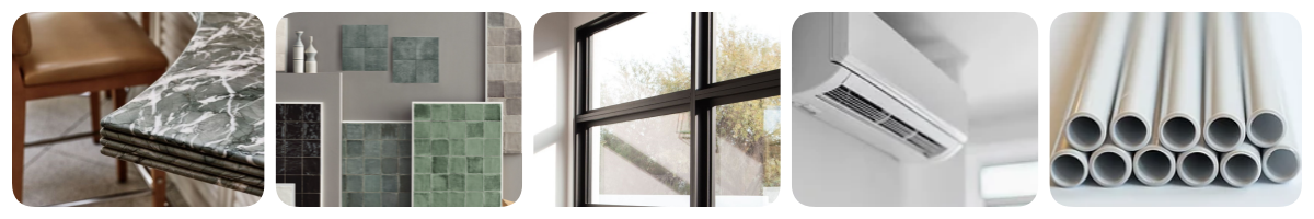 建筑內(nèi)部和飾面:陶瓷和瓷磚、涂料、密封劑和粘合劑、地板、天花板、墻壁其他室內(nèi)飾面、室內(nèi)建筑照明、廚房、浴室和衛(wèi)生潔具等;